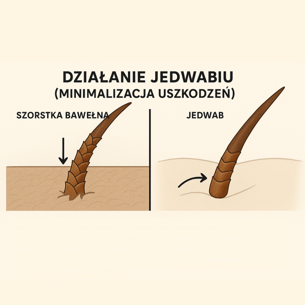"Działanie Jedwabiu (Minimalizacja Uszkodzeń): Włosy składają się z nachodzących na siebie łusek. Podczas snu na szorstkiej bawełnie te łuski zahaczają o włókna poszewki, prowadząc do uszkodzenia i łamliwości. Jedwab, dzięki ekstremalnej gładkości, umożliwia swobodne przesuwanie się włosa (minimalny opór), bez podnoszenia i uszkadzania łuski. Redukuje to siły tarcia, co jest bezpośrednią interwencją w proces powstawania łamliwości opisanym w badaniu."