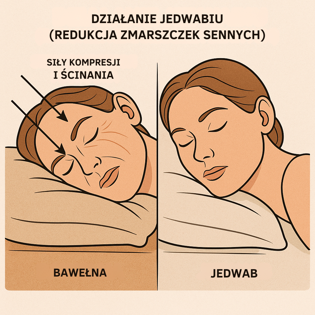 Ponieważ jedwabne poszewki są gładkie i minimalizują tarcie (siły ścinające) oraz nie „ugniatają” skóry tak mocno jak szorstka bawełna, ten artykuł naukowy potwierdza zasadność stosowania jedwabiu jako środka redukującego powstawanie zmarszczek sennych.