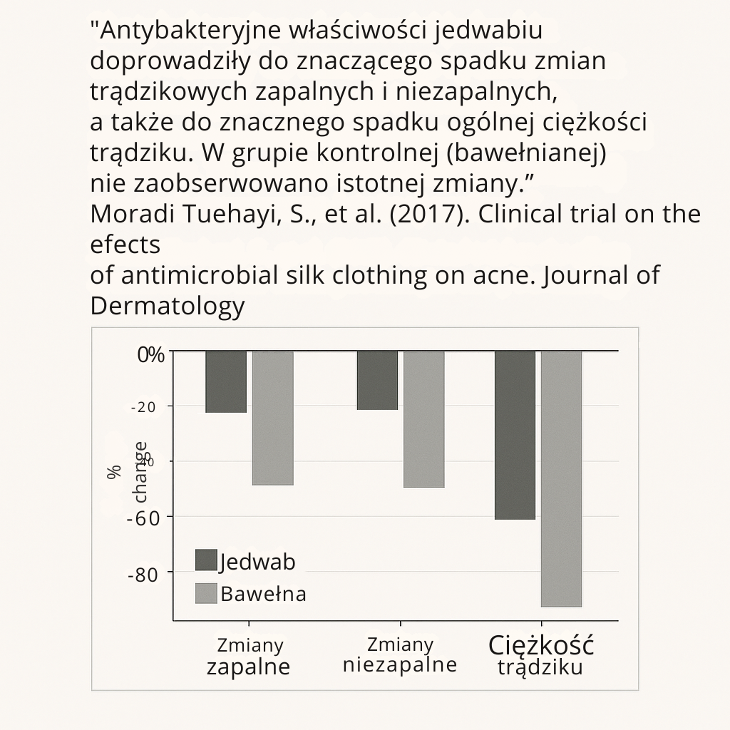 "Antybakteryjne właściwości jedwabiu doprowadziły do znaczącego spadku zmian trądzikowych zapalnych i niezapalnych, a także do znacznego spadku ogólnej ciężkości trądziku. W grupie kontrolnej (bawełnianej) nie zaobserwowano istotnej zmiany."