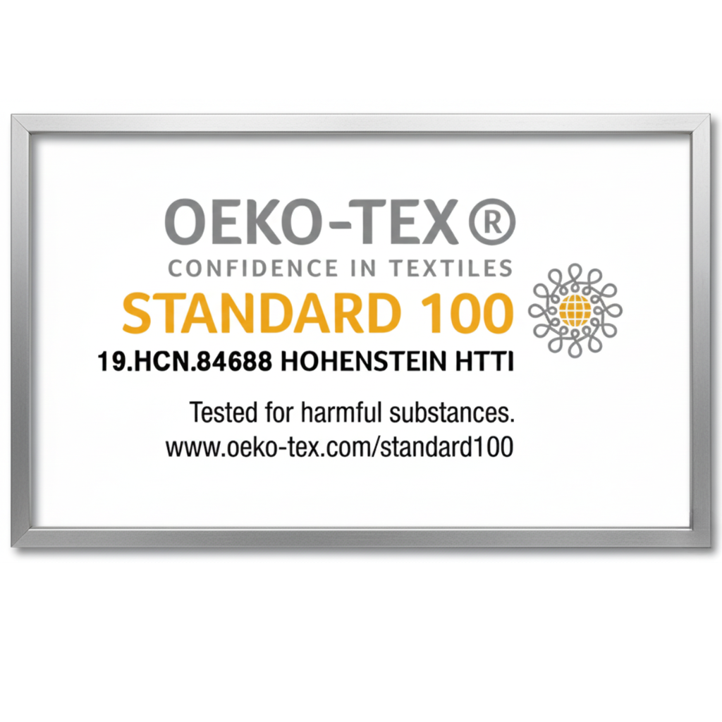 Produkt posiada certyfikat OEKO-TEX® Standard 100, co potwierdza, że został przebadany pod kątem ponad 100 szkodliwych substancji i jest całkowicie bezpieczny dla skóry. Certyfikat gwarantuje, że materiał spełnia rygorystyczne normy jakości i bezpieczeństwa, dzięki czemu możesz korzystać z produktu z pełnym zaufaniem — nawet przy codziennym, bezpośrednim kontakcie ze skórą.